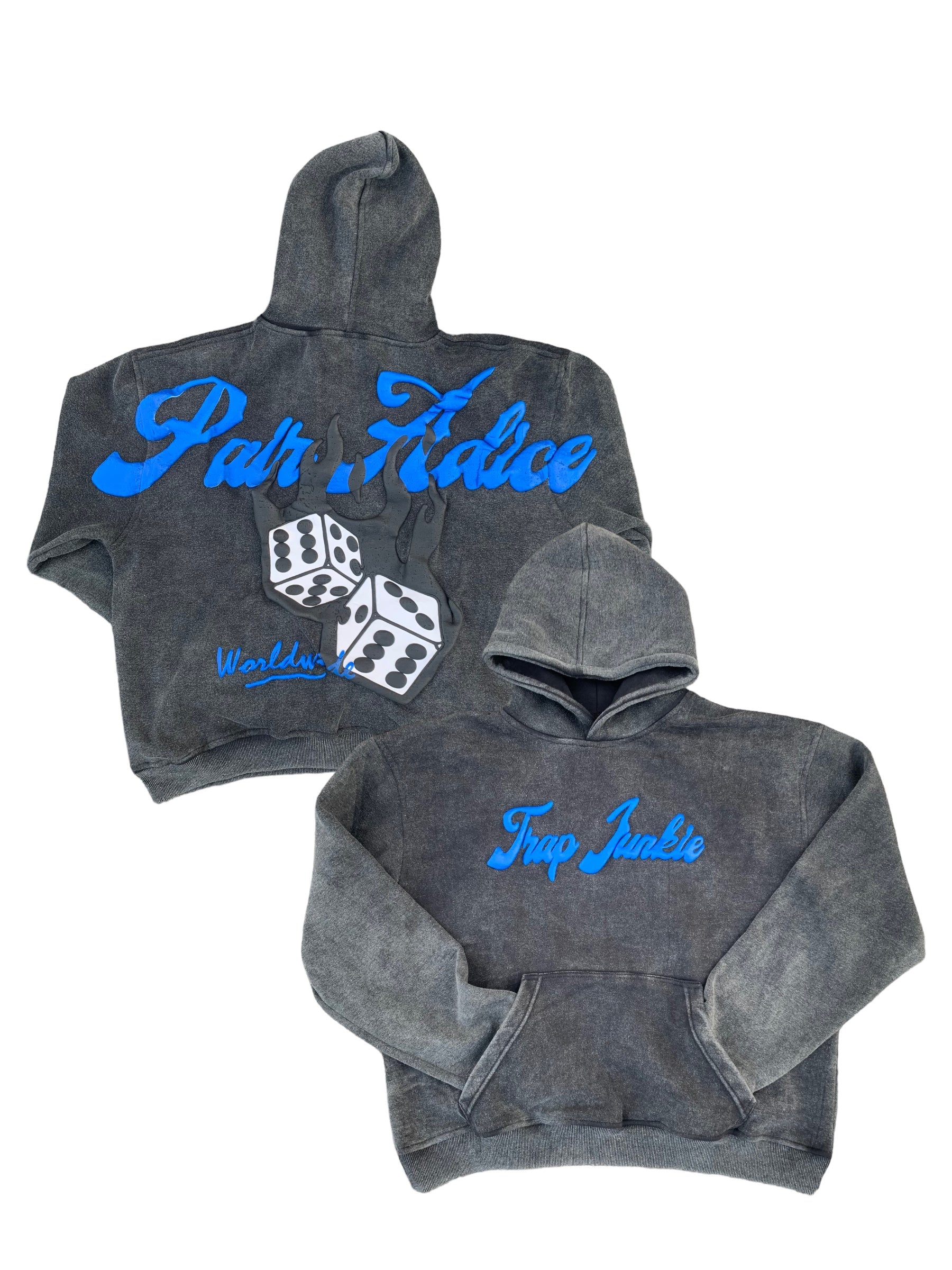 Heavyweight oversized acid washed hooded sweatshirt. Our signature "Trap Junkie" logo puff screen printed across the front, and our new unreleased burning PairAdice logo design in puff print on the back.