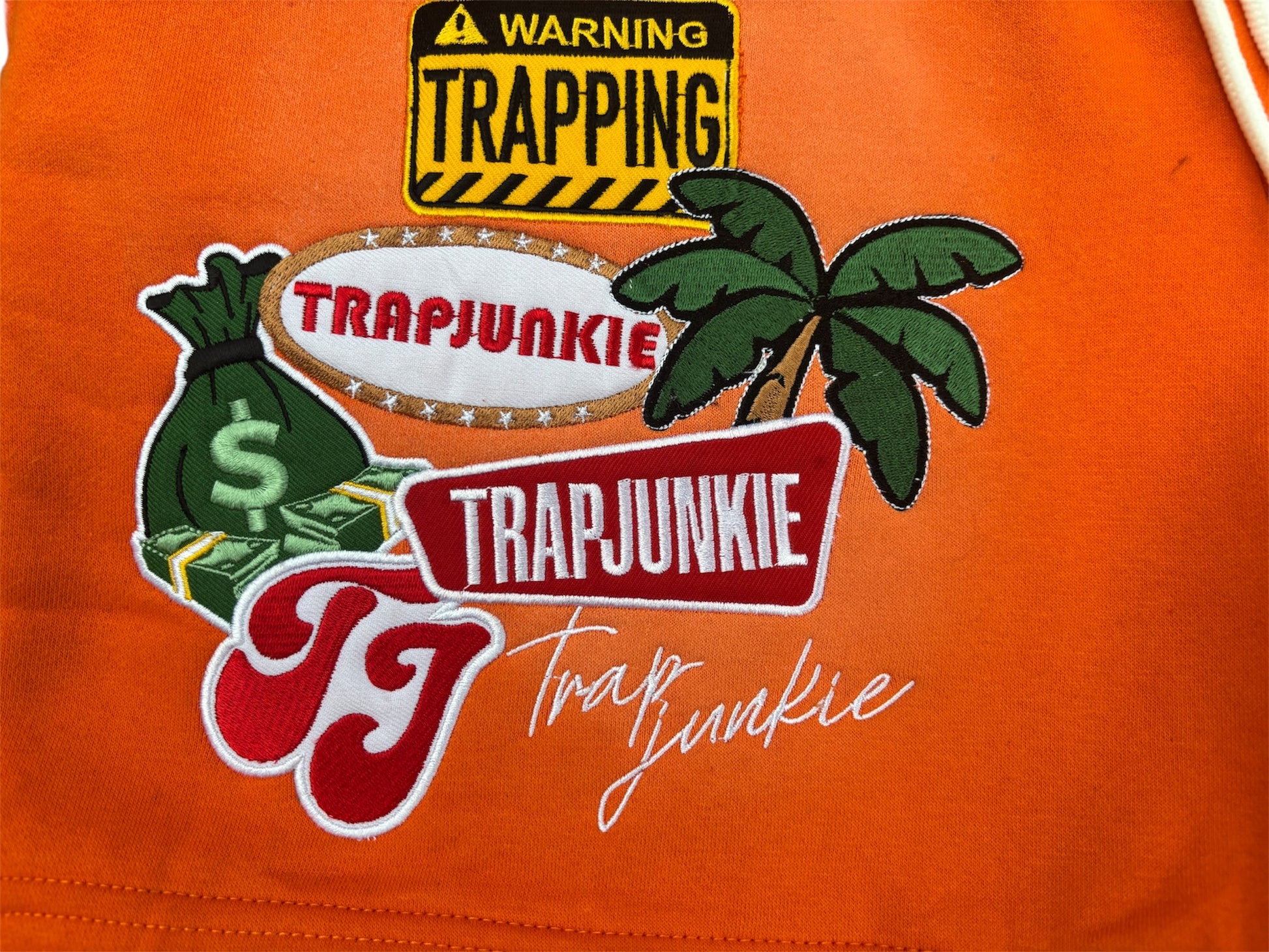 Top quality cotton shorts with our patchwork designs embroidered. Deep pockets with a third pocket on the back. Orange cotton sun faded material with White strings.