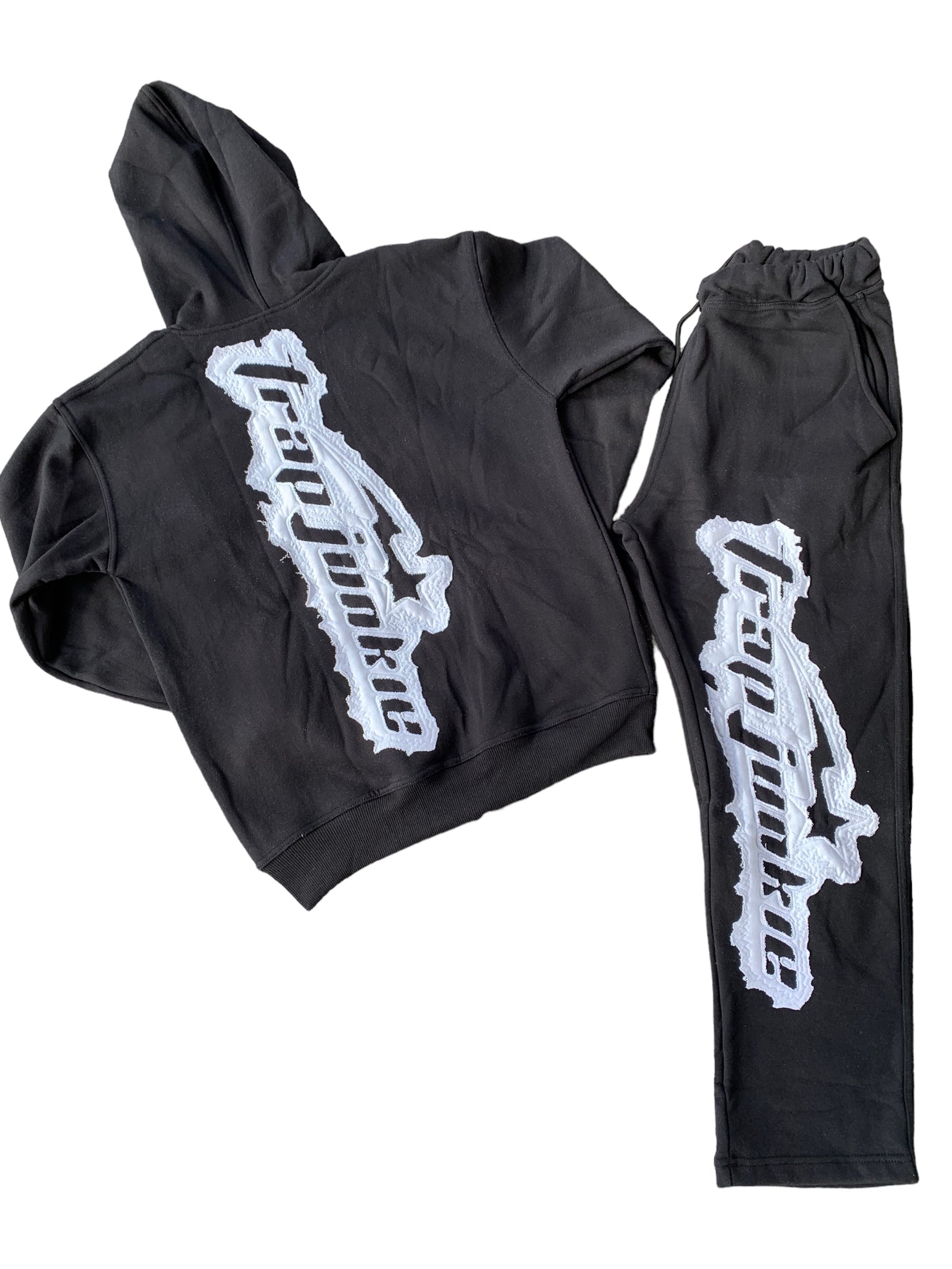 New TrapStar Sweatsuit. Grey heavyweight cotton hoodie with our shooting star Trap Junkie design stitched in distressed embroidery on the back and also on the left pants leg. Black satin material inside the hood. Our original bear face logo embroidered on the front. Black and white “Addicted To Hustling” woven label on the front hoodie pocket and back pants pocket.