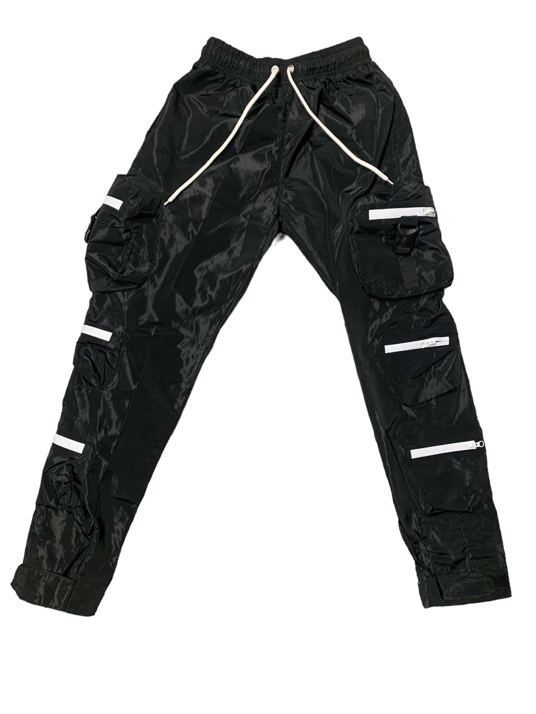 New windbreaker cargo pants with adjustable leg opening with velcro straps for flared or slim fit. Pants have 2 cargo pockets and 4 small pockets with zippers.